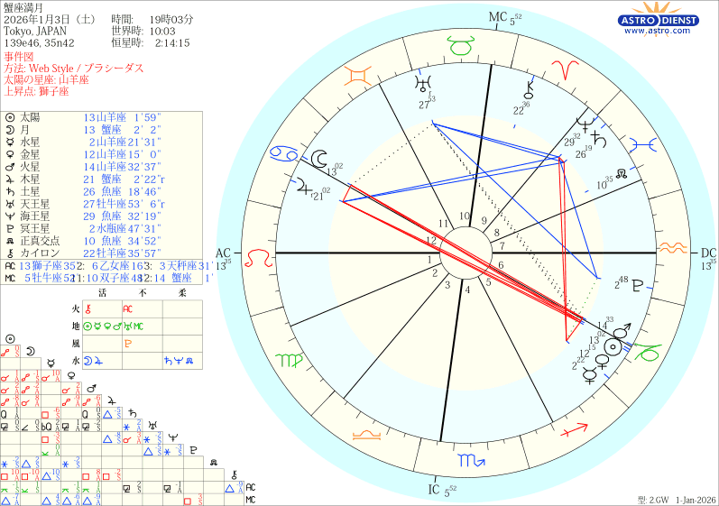 自分を甘やかすための鎖国状態にしたい蟹座の月と、現場で自分と戦い抜き、結果を出す山羊座の太陽。このコントラストの強い自己対峙は、蟹座特有の感情による「やる気」といった不確かなものを、システムという強固な「骨格」へと変えるられるのか。 古いアバターを脱ぎ捨て深い虚空を通過した者だけが、更地になった魂に、普遍的で揺るぎない新たなレリーフを刻むことができるのです。