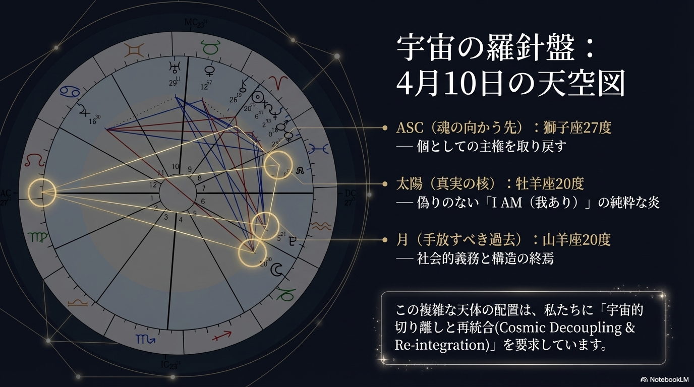 私たちはこれまで、波風を立てないことと引き換えに真実の自分を差し出し、誰かの人生の脇役を演じる静かな自己犠牲(等価交換)を続けてきました。しかし、その時代はもう間も無く終わろうとしています。世間の顔色を伺い、自らを小さく見積もる古い思考回路を断ち切らねばなりません。あなたの変わらぬ絶対的な軸である出生図の太陽を、何者にも邪魔されずに燃やす時が来ています。
