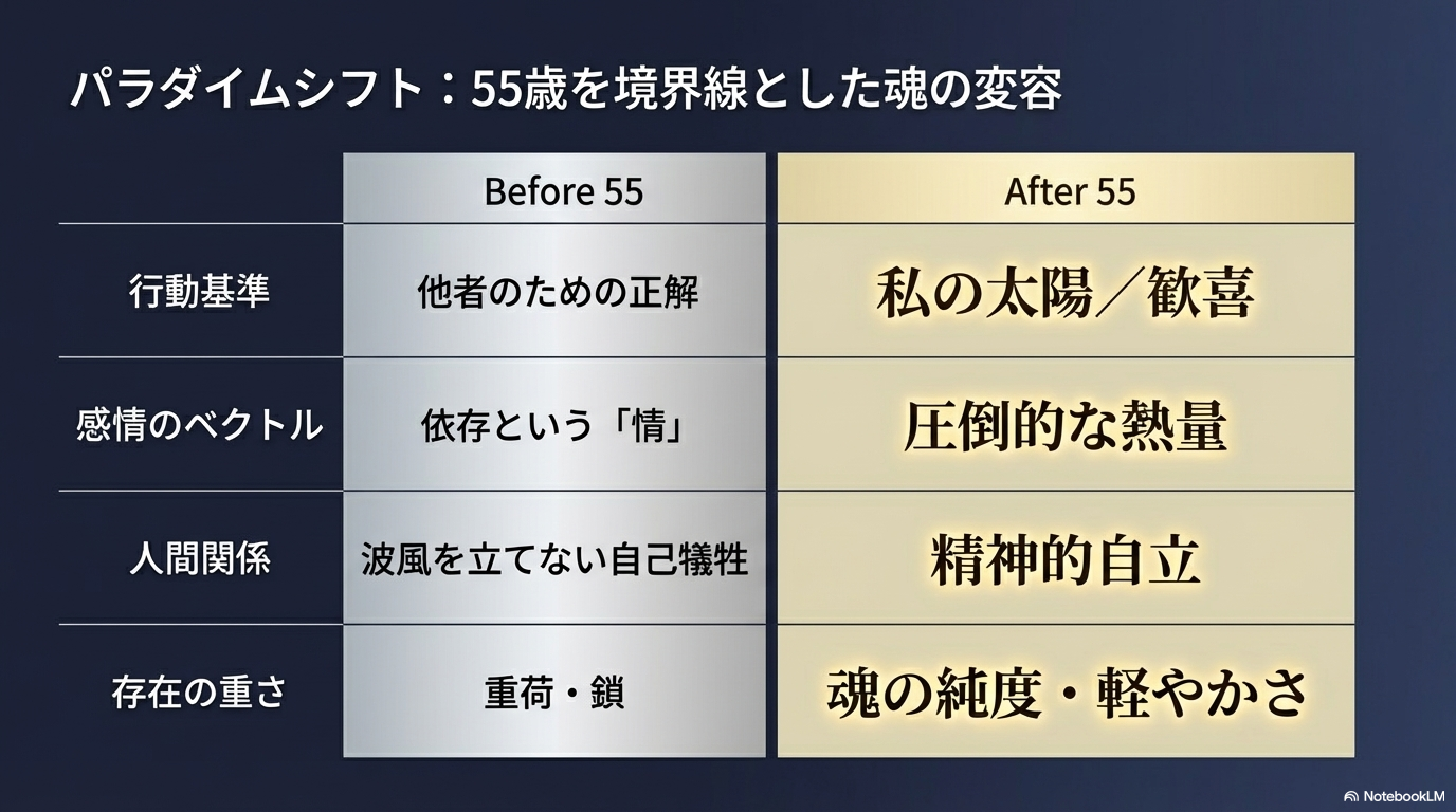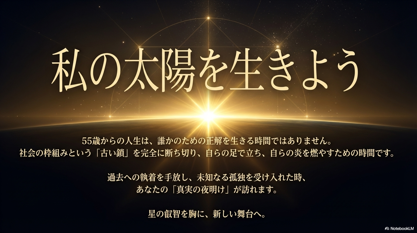 そのように視覚化すれば、社会的な役割すらも喜部べき今の役割と再定義でき、真の「私の太陽」を燃やし始められる。その冷徹で澄み切った覚悟が定まったとき、55歳からの新しい人生の幕が圧倒的な熱量とともに開くことでしょう。
